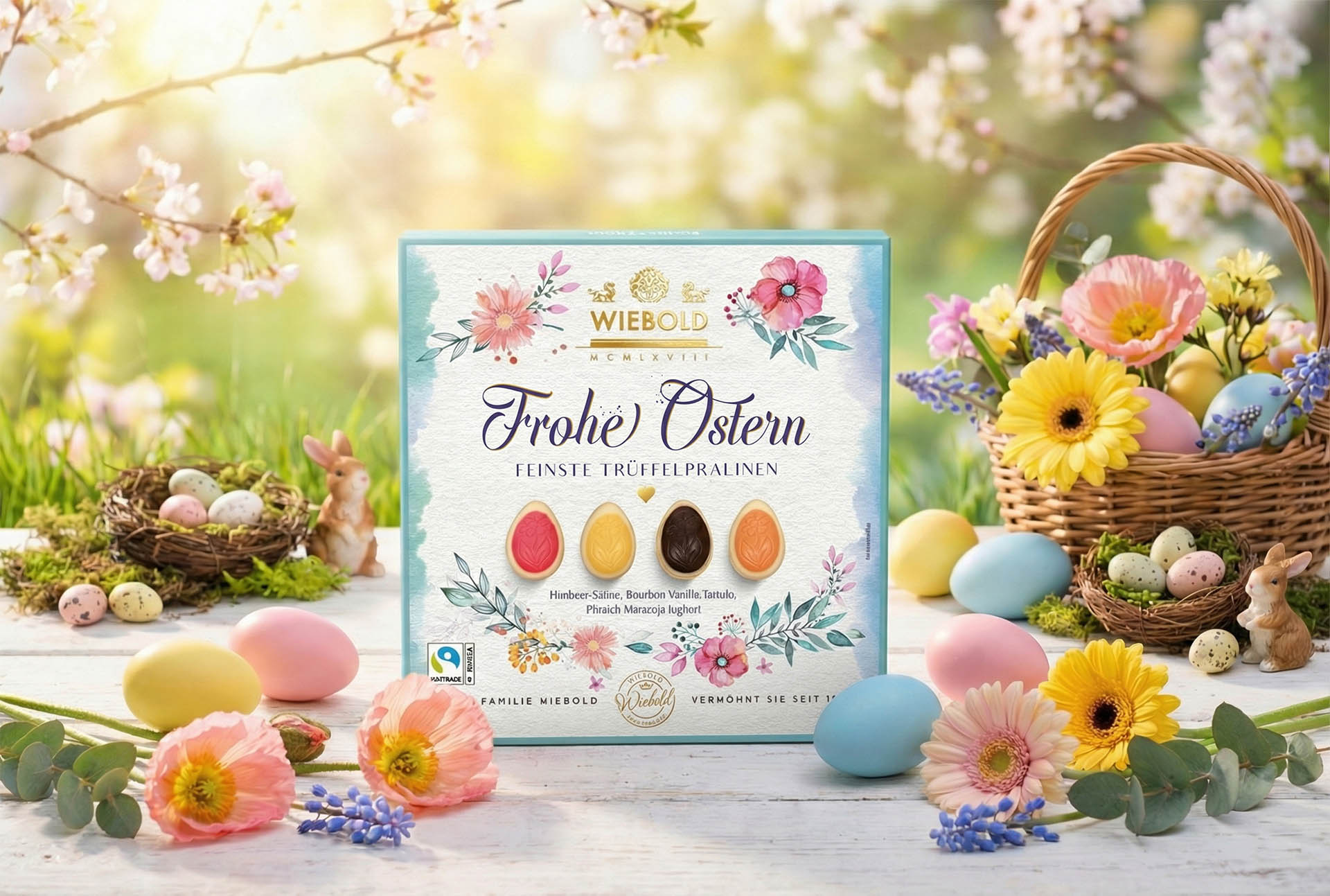 Die edle Pralinenschachtel „Frohe Ostern – Feinste Trüffelpralinen“ vereint festliches Design mit höchstem Genuss. Die stilvoll gestaltete Verpackung mit floralen Details und eleganten Goldakzenten macht sie zu einem besonderen Blickfang und zur perfekten Geschenkidee für die Osterzeit. Eine erlesene Auswahl feinster Trüffelpralinen in österlichen Formen verspricht abwechslungsreiche Geschmackserlebnisse und hochwertige Confiserie-Qualität. Ob als liebevolle Aufmerksamkeit oder zum eigenen Verwöhnen – diese Osterpralinen stehen für Genussmomente, die in Erinnerung bleiben.